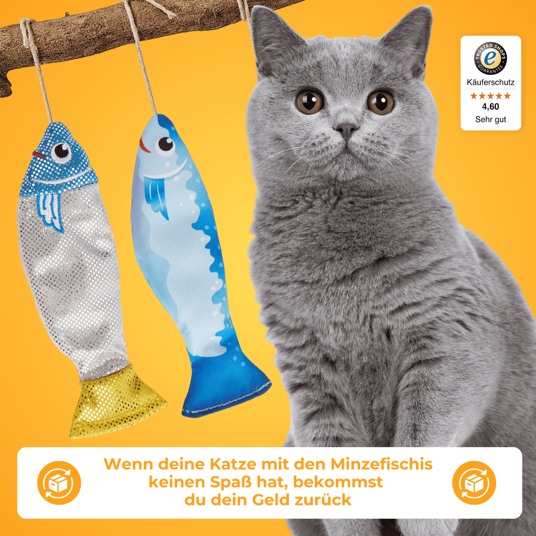Du kannst die Minzefischis ganz ohne Risiko ausprobieren. Wenn deine Katze keinen Spaß am Spielen hat oder die Fischis nicht annimmt, bekommst du dein Geld zurück. So kannst du das Spielzeug in Ruhe testen und selbst sehen, wie sehr deine Katze die Katzenminze liebt. Deine Zufriedenheit und das Wohlbefinden deiner Katze stehen dabei immer im Mittelpunkt.
