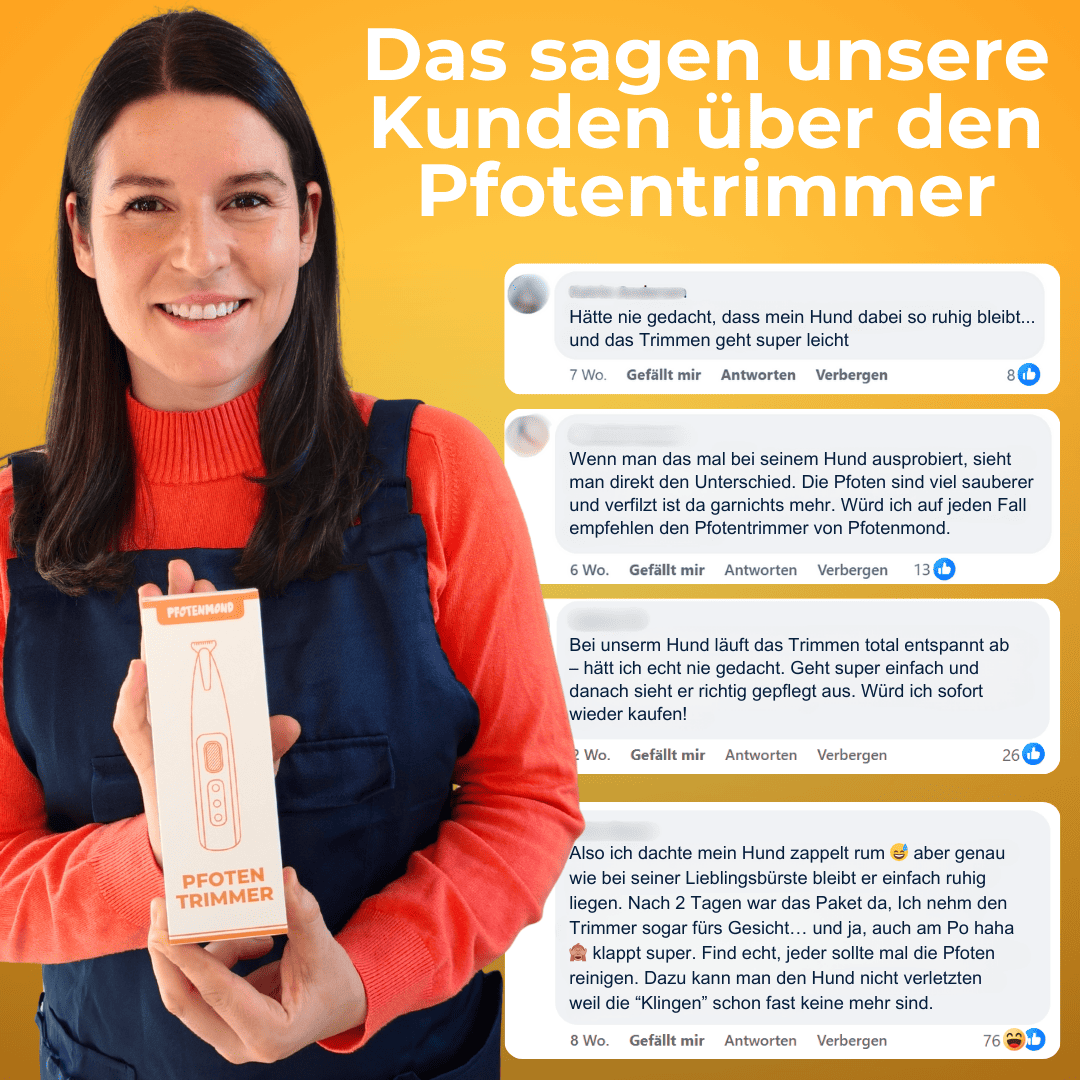 Mehr als 20.000 zufriedene Hundebesitzer vertrauen auf die sichere und sanfte Pflege mit dem Pfotentrimmer. Teste den Pfotentrimmer jetzt 30 Tage risikofrei – und solltest du nicht überzeugt sein, bekommst du dein Geld zurück!